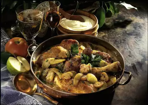 Drain off excess fat. Pour Calvados over the chicken and flambé. Fill up with cider and cook covered at medium heat for about 30 minutes. In the meantime clean, wash and slice the mushrooms. Peel and quarter apples, cut out the core. Cut quarters into thin slices. Heat the fat and fry the mushrooms until golden brown. Add apple slices and season with salt and pepper. Take chicken parts aside. Add mushrooms and apple slices to the sauce.