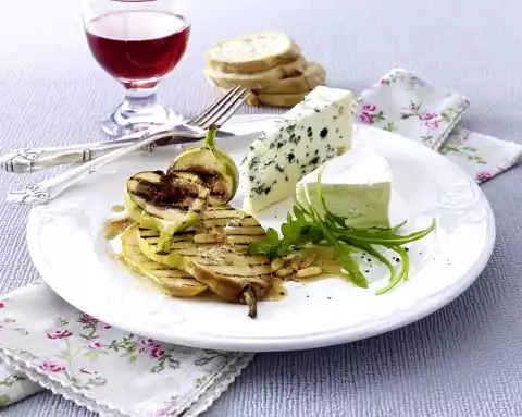 Add the fruit in 2 portions and grill on both sides for 1-2 minutes. Glaze with maple syrup and take out. Arrange fruit on plates, sprinkle with pepper. Divide the Brie and Roquefort into 4 pieces and spread on the plates with rocket.