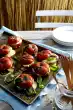 3 Cut the salmon slices into pieces and place them on top of the ricotta cream. Tie a sprig of chives around them and serve as an aperitif or starter.