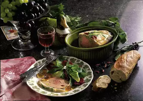 Decorate the pâté with tarragon, chilli and peppercorns. Pour a little cooled broth on top. Let the remaining stock set and dice. Cut the pâté into slices and serve. Add jelly cubes and fresh salad.