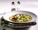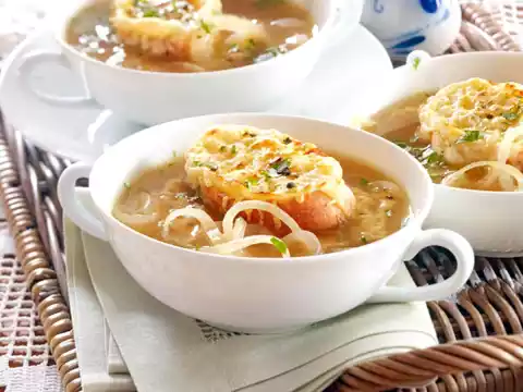Sprinkle flour over the onions and sauté lightly. Stir in wine and ¾ l water bit by bit, add broth. Season with salt and pepper. Bring to the boil and simmer covered for about 20 minutes.