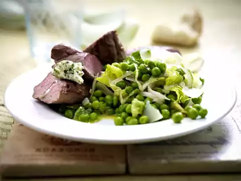 Add 4 tablespoons of olive oil and shallots, steam for 3-4 minutes while turning, remove from heat and fold in salad. Season to taste with salt, pepper and sugar. Slice parmesan. Season meat with salt and pepper, remove from the pan, cut into slices and arrange on plates with peas and shallots vegetables.