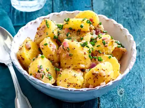 Stir in mustard. Pour into a large bowl. Cut potatoes in thick slices directly into the hot marinade. Fold in chives. Season to taste with salt and pepper and leave to stand for about 1 hour.