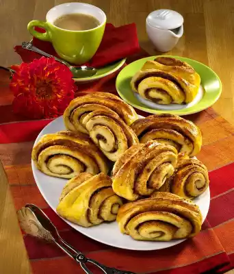 Cover the dough and let it rise again for about 40 minutes. Melt 50 g fat. Mix 75 g sugar and cinnamon. Separate the egg. Mix egg yolk and cream. Roll out the yeast dough on a floured work surface to a rectangle (45 x 30 cm). Spread the dough sheet with lukewarm, liquid fat and sprinkle evenly with the sugar-cinnamon mixture. Roll up the yeast dough firmly from the long side. Brush the edge of the dough with egg white and press down well. Cut the roll into 3-4 cm wide slices and press them in lengthwise with a spoon handle. Put the French rolls on a baking tray covered with baking paper and let them rise for another 15-20 minutes. Then brush with egg yolk.