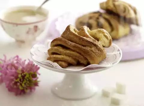 Coat the dough plate with 50 g soft fat and sprinkle evenly with the sugar-cinnamon mixture, except for 2 tablespoons. Squeeze out the sultanas and spread on one half. Roll up the yeast dough firmly from the long side. Cut the roll trapezoidally into 3-4 cm wide slices and press them in lengthwise with the handle of a wooden spoon. Put the French rolls on a baking tray lined with baking paper and let them rise for another 15-20 minutes. Then brush with egg yolk and sprinkle with remaining cinnamon sugar. Bake in the preheated oven (electric cooker: 200 °C/ convection oven: 175 °C/ gas: level 3) for 10-15 minutes. Let them cool down