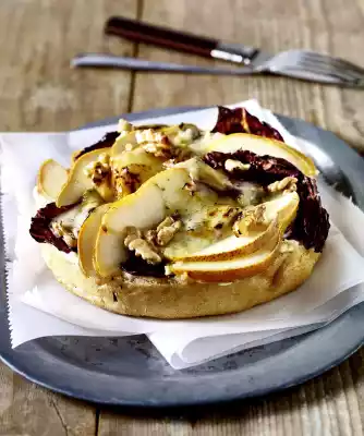 Clean, wash and drain the radicchio. Pluck the radicchio leaves into pieces. Wash the pears, grate them dry, cut them into thin slices and sprinkle them with lemon juice. Coarsely chop the walnut kernels.
