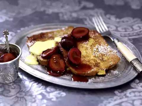 Heat the clarified butter in portions in a large coated pan. Fry two slices of bread (let them drip off a little beforehand) on each side for 3-4 minutes, turning them over medium heat until golden brown. Drain on kitchen paper and keep the finished Arme Ritter warm. Dust the knights with icing sugar. Serve with plum compote and some sauce. Add the rest of the compote and sauce