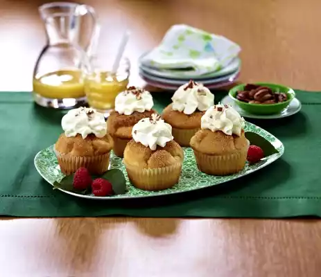 In einer kleinen Schüssel schwere Sahne und den restlichen Ahornsirup dickflüssig schlagen. Die Sahne in eine Tüte mit einer mittelgroßen offenen Sterndekorspitze geben. (Ateco #843) Muffin-Oberteile mit Sahne bestreichen. Falls gewünscht, mit Pekannüssen garnieren. Warm servieren