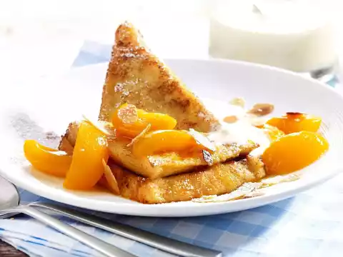 Serve with the apricots. Sprinkle with almonds and dust with icing sugar. Serve immediately. Serve with vanilla yoghurt.
