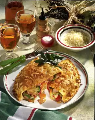 Place the dough plates on top of each other and roll out round (approx. 30 cm Ø) on the tray. Put vegetables, ham and half of the cheese on one half of the dough. Separate the egg. Brush edges of dough with egg white, fold free dough half over.