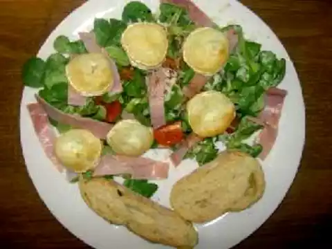 After 14 minutes, remove the goat's cheese with the ciabatta from the oven. Place the goat's cheese on the finished salad and then cut the bread open - that's it!