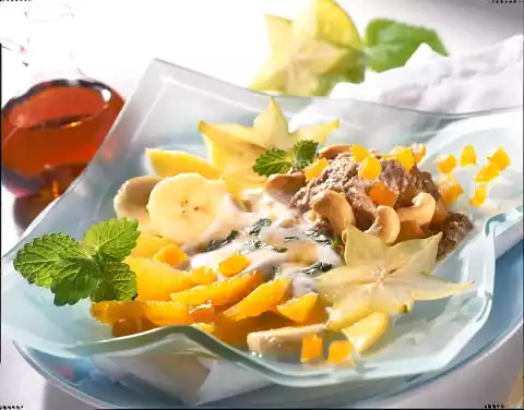 Pour 500 ml of warm water over wholemeal meal. Leave to soak overnight. Finely dice the apricots. Peel the mango and cut into slices from the core. Peel oranges so that the white skin is completely removed.