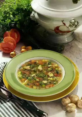 Wash, clean and slice the mushrooms. Heat oil in a pot. Sauté garlic and shallots. Add herbs, vegetables and tomatoes. Add 3/4 litre water and bring to the boil. Cook everything for 4-5 minutes.