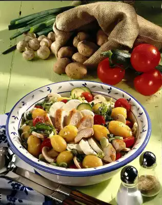 Quench the potatoes and remove the skin. Mix stock, vinegar, salt, pepper and 1 pinch of sugar. Fold in 3 tablespoons of oil. Mix marinade with potatoes, prepared vegetables and cheese. Leave to stand for about 30 minutes.