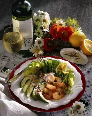Halve the avocado, peel it, remove the stone and cut the avocado into slices. Sprinkle the avocado slices with remaining lemon juice. Heat the oil in a pan, fry the scampi for about 2 minutes while turning them and season with salt and pepper. Arrange avocado, salad, radishes and scampi on plates, add some garlic-yoghurt dip, sprinkle with the remaining chives and serve garnished with a lemon wheel. Add the rest of the dip extra