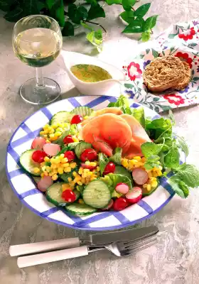 Pour the corn onto a sieve, rinse briefly with cold water and drain. Put 8 radishes with greenery aside for garnishing. Clean and wash the remaining radishes. Depending on size, cut in half or quarter.