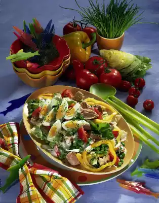 Mix salad cream, yoghurt and lemon juice. Season with salt, pepper and sugar. Mix iceberg lettuce, peas, tomatoes, tuna and paprika. Place on a plate and pour the salad cream over it. Wash the chives, dab dry and cut into fine rolls. Place egg slices on the salad, sprinkle with chives and serve garnished with parsley as desired