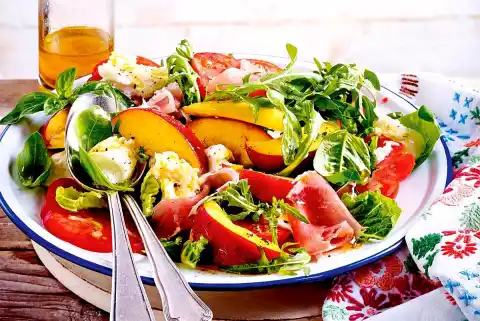 For the salad, wash and slice the tomatoes. Wash the nectarines and cut them into slices from the stone. Wash and clean the lettuce and drain well. Cut romaine lettuce into strips. Wash the basil and pluck the leaves. Pluck the mozzarella into pieces. Arrange everything with Parma ham on a plate.