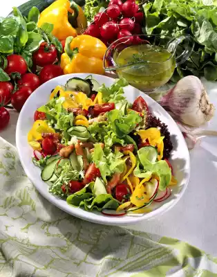 Clean, wash and drain the peppers, cucumber, radishes and tomatoes. Cucumber in slices, paprika in fine strips planes. Cut radishes into thin slices, quarter tomatoes. Clean, wash and drain lettuce leaves well.