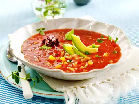 Chill for about 4 hours. Lightly roast the pine nuts in a pan without fat, remove. Cut avocado in half, remove stone. Remove the flesh from the skin and cut into slices. Arrange tomato soup in plates. Arrange avocado slices, pine nuts and remaining paprika cubes on top. Garnish with oregano and possibly oregano flowers