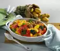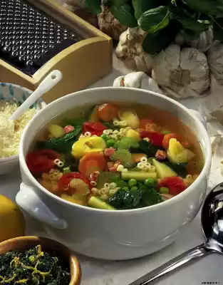 Fry the ham and garlic in a pot in hot oil. Fry potatoes and vegetables, possibly except for tomato and spinach. Add 1/4 l water, stir in broth, bring to the boil. Simmer covered for about 15 minutes