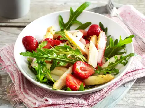 Clean, wash, spin dry and possibly pluck smaller rocket. Fold into the asparagus salad and serve. Fresh baguette tastes good with it.