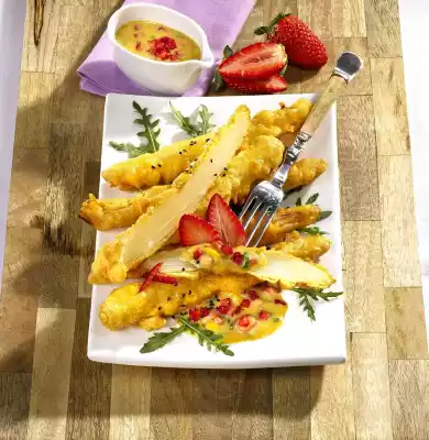 Mix mustard, vinegar and oil. Carefully fold in spring onions, mango and strawberries. Season with salt and pepper. Whisk the parmesan, eggs and 4 tablespoons of flour. Season with salt and pepper. Roll the asparagus spears first in the remaining flour, then in the batter. Heat the frying fat. Fry the asparagus for 2-3 minutes until golden brown. Garnish asparagus and relish with rocket and strawberries.