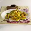 Fry in the hot olive oil until golden brown, turning. In the meantime heat sunflower oil. Fry garlic and bulgur in it. Add tomatoes and basil, bring to the boil briefly. Season with salt, pepper and lemon juice.