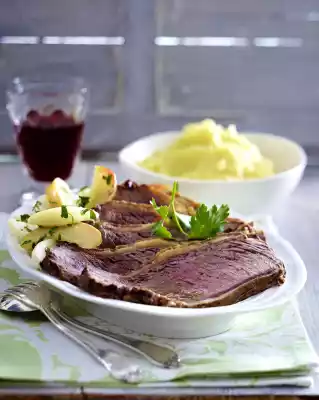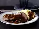 Remove the roast from the oven, remove from the stock, keep warm. Pour stock through a sieve into a pot. Skim off fat. Add vinegar, bring to the boil and simmer for 12-15 minutes. Season to taste with salt and pepper