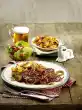 Wash parsley, shake dry and cut into strips. Mix parsley into the vegetables. Cut the meat open, arrange on a plate with the vegetables and stock garnished with parsley. Add the mashed potatoes and horseradish in a bowl