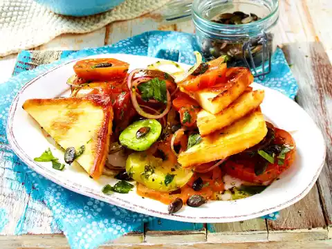 Roast pumpkin seeds in a pan without fat, remove. Heat 3 tablespoons of oil in the pan. Fry cheese in it in portions on each side for about 2 minutes. Halve diagonally, arrange on tomato salad and sprinkle with pumpkin seeds.