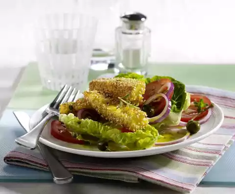 Heat 2 tablespoons of oil in a frying pan. Fry the cheese for 1-2 minutes on each side until golden brown. Mix salad, tomatoes, onions, caper apples and marinade. Arrange on plates and arrange cheese sticks on top.