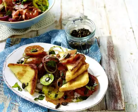 Remove and keep warm. Cut cheese diagonally in half, arrange with some tomato salad and sprinkle with some pumpkin seeds. Add remaining tomato salad and remaining pumpkin seeds.