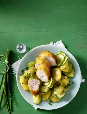 Remove potatoes from the heat. Wash the chives, shake dry and cut into small rolls. Wash, clean and slice the cucumber. Fold the cucumber with mustard and vinegar into the potatoes, which are no longer hot, and season the salad with salt and pepper.