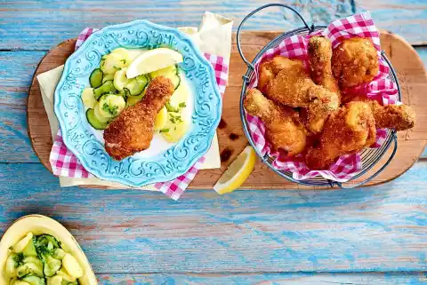 Wash the cucumber, slice or cut it into thin slices and fold into the potato salad with the horseradish. Season to taste with salt and pepper. Serve with the fried chicken.