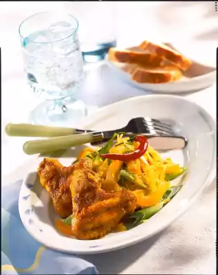 Wash chicken wings, dab dry and salt. Mix curry, paprika and oil and coat chicken wings with it. Bake on a baking tray in a preheated oven (electric cooker: 200 °C/ gas: level 3) for about 15 minutes.