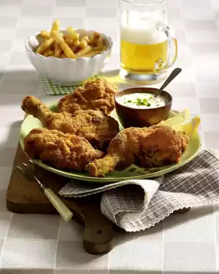 Turn the chicken parts first in flour, then in egg and finally in breadcrumbs. Heat oil in a pot. Fry the meat in the oil for about 5 minutes until light brown. Line a baking tray with baking paper and spread the chicken pieces on it. Bake in a preheated oven (electric cooker: 175 °C/ convection oven: 150 °C/ gas: level 2) for approx. 40 minutes. Wash the cucumber and cut into small cubes. Mix mayonnaise and yoghurt. Season to taste with salt, pepper and sugar. Wash the chives, cut into fine rolls and stir into the mayonnaise with the cucumber. Arrange fried chicken with lettuce and lemon on a plate.