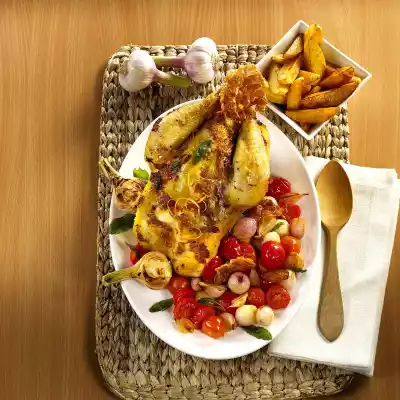 Season chicken from the inside with salt and pepper. Quarter the oranges and place them in the chicken's abdominal cavity. Close abdominal opening, tie legs and wings together with kitchen string. Place the chicken in a roaster with the breast side up. Add stock and roast in the preheated oven (electric cooker: 200 °C/ convection oven: 175 °C/ gas: level 3) for 1 1/4 -1 1/2 hours. In the meantime peel and wash the potatoes, cut them into slices and season with salt. Spread the potatoes on a greased baking tray and bake 35 minutes before the chicken is done. Peel and possibly halve the shallots. Wash, clean and dry the tomatoes and possibly halve them. Leave 4 slices of ham in a pan without fat until crispy. Remove the ham, let it cool down and rip it roughly into pieces. Melt clarified butter in the hot pan. Steam shallots for about 5 minutes until translucent.