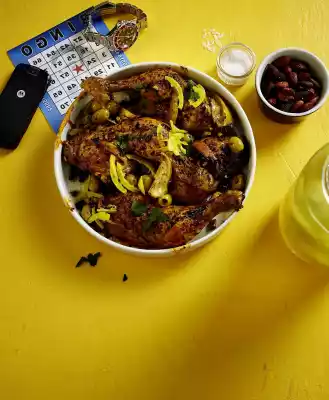 Sprinkle legs with olives and 1 handful of almonds. Serve with the remaining roasted almonds.