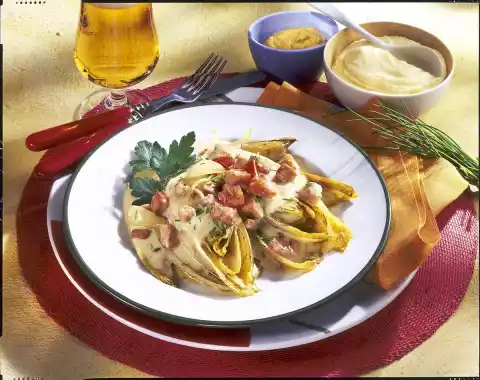 Fry the chicory halves on each side for about 2 minutes. Deglaze with the remaining stock and cook for another 3 minutes. For the puree, boil 3/8 litres of water and 1/2 teaspoon of salt. Remove the pot from the heat. Add cold milk and remaining fat. Stir in the puree flakes with a wooden spoon. Let it swell for about 1 minute and stir again. Arrange chicory and sauce in portions. Wash the chives, cut them into small rolls and sprinkle over them. Add mashed potatoes. Serve garnished with parsley