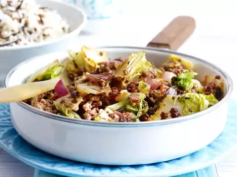Add onion and cabbage and fry for about 10 minutes, turning occasionally. Add 6 tablespoons of water and Worcester sauce and bring to the boil. Season to taste with salt and Sambal Oelek. Add the rice or fold in immediately.