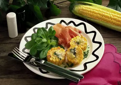 Heat butter in a pan and fry the corn wheels in it until golden brown. Add garlic and basil. Mix vinegar with salt and pepper. Whip the oil into it. Marinate the lamb's lettuce and arrange on plates with the corn wheels and the Parma ham