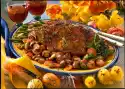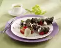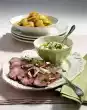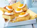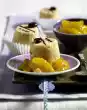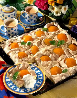 20 minutes before the end of the baking time, remove the cake from the oven and spread the meringue on the cake, between the peaches. Remove the cake from the oven and serve with lemon balm and whipped cream.
