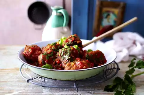 Add the balls to the tomato sauce and heat up again briefly. In the meantime wash parsley, shake dry and chop finely. Mix parsley, except for 1 tbsp., and remaining basil leaves, except for 5-6 leaves, into the sauce.