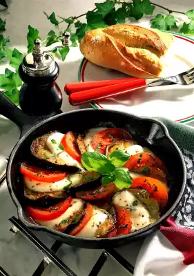 Drain the mozzarella and also cut into slices. Layer aubergines, tomatoes and mozzarella in the pan and season with salt and pepper. Wash the basil and thyme. Pluck the thyme leaves from the stalks and cut the basil into strips, except for something to garnish.