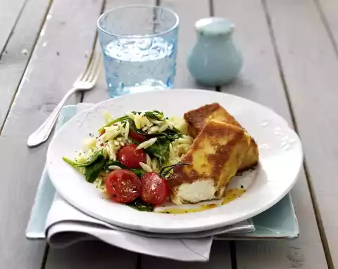 In the meantime heat 2 tablespoons of oil in a coated pan. Fry the cheese for 4-5 minutes until golden brown. Drain the pasta and mix it with the spinach. Season to taste with salt and pepper. Arrange everything.