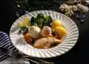 Arrange fish, carrots and some sauce on plates. Garnish with wild garlic. Serve the rest of the sauce separately.