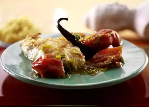Season tomatoes with vanilla, salt and pepper and pour on 100 ml water. Simmer for about 5 minutes. Add onions for the last 3 minutes. Heat 2 tablespoons of oil in a second pan. Fry the fish on each side for about 3 minutes, depending on the thickness. Arrange fish and tomatoes on plates. Add the millet