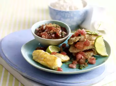 Fry the fish in it in portions on each side for about 3 minutes. Arrange fish, rice and salsa, garnish with coriander and lime wedges.