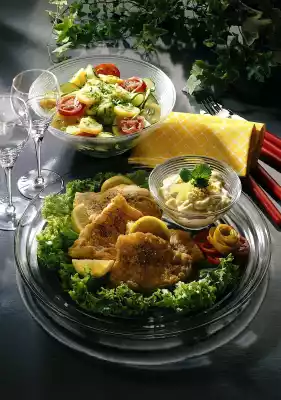 Turn fish first in flour, then in the egg. Fry in hot oil on both sides for 4-5 minutes. Season sour cream with remaining lemon juice, salt and pepper. Wash the chives, cut them into small rolls and sprinkle them on top. Arrange fish with lemon and salad leaves. Add sour cream and potato salad